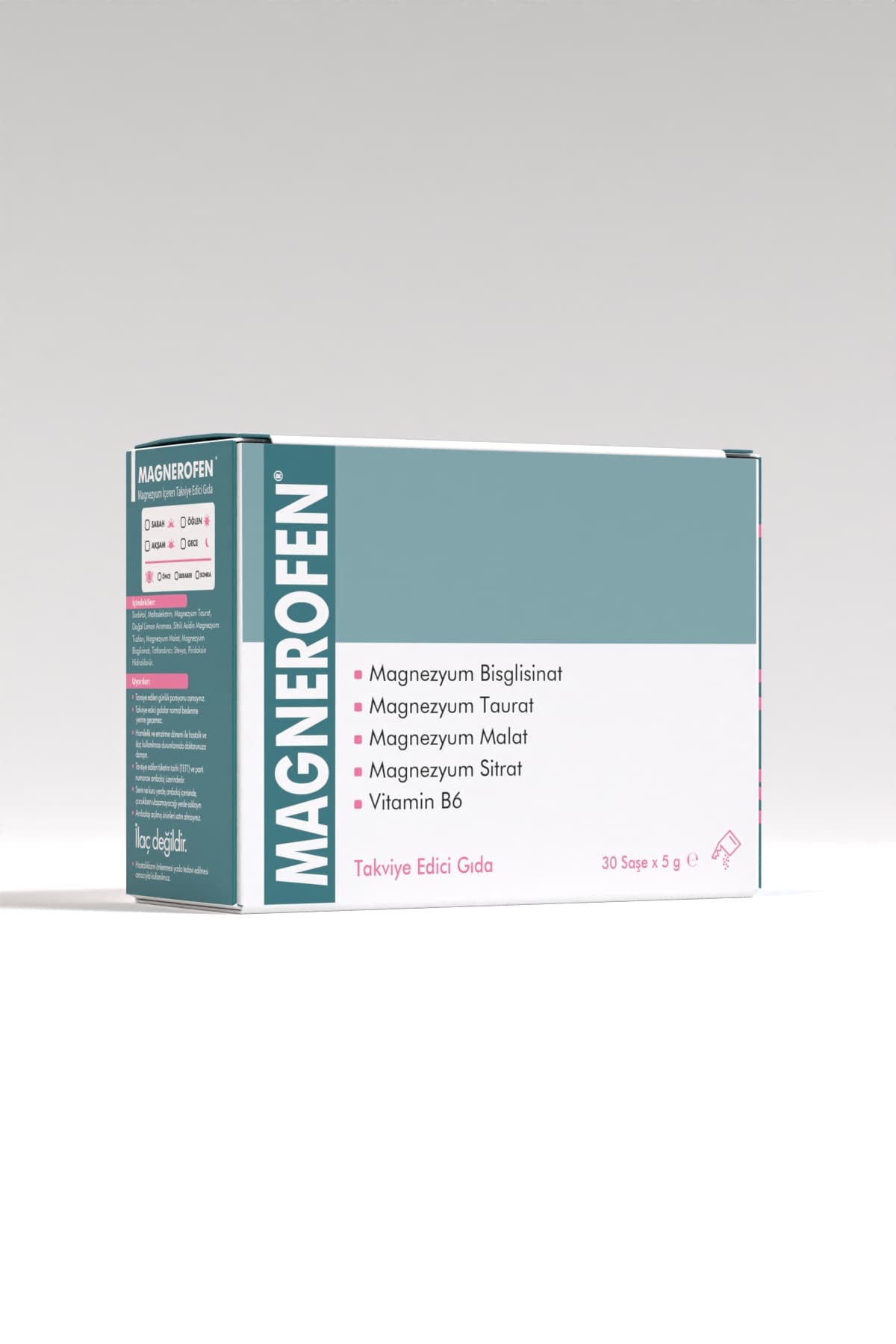 SUNVERALABS Magnerofen; Magnezyum Taurat, Magnezyum Malat, Magnezyum Bisglisinat, Piridoksin Hidroklorür hammaddelerinin bir arada kullanıldığı saşe formunda takviye edici gıdadır.